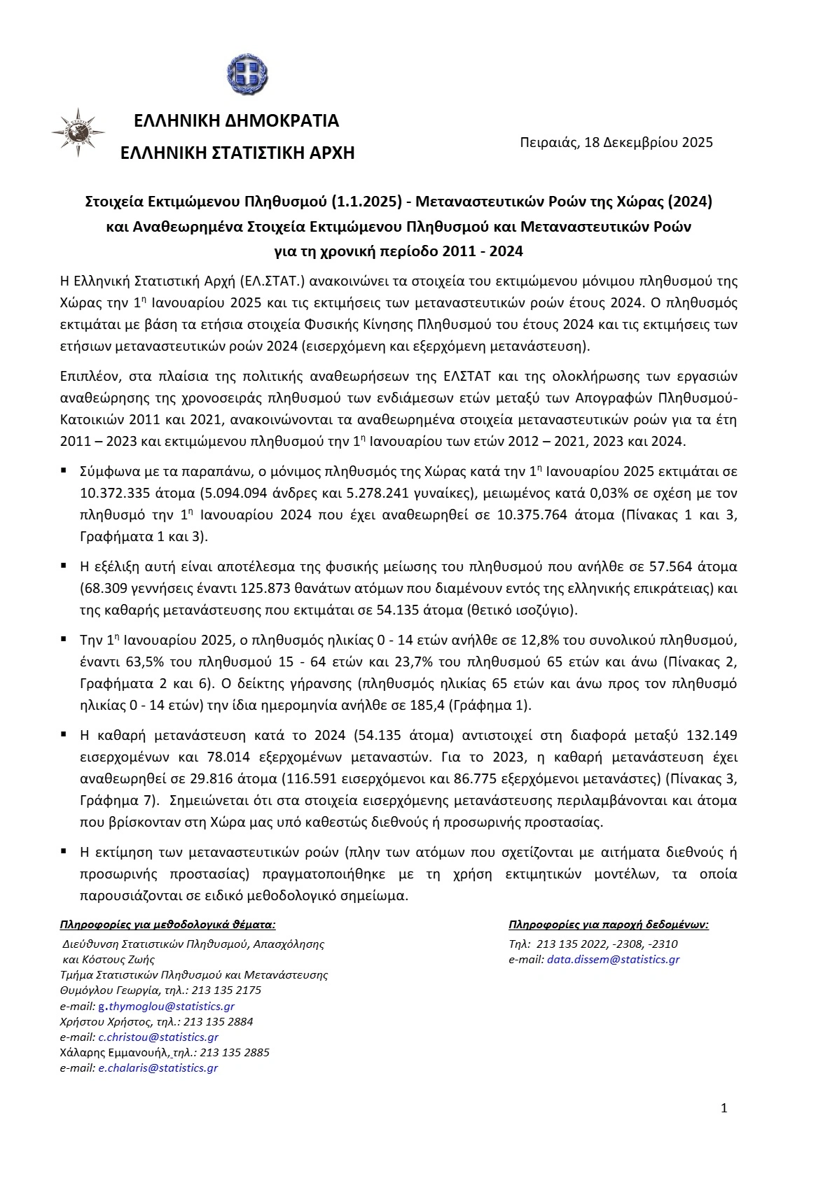 – O μόνιμος πληθυσμός της Χώρας κατά την 1η Ιανουαρίου 2025 εκτιμάται σε 10.372.335 άτομα (5.094.094 άνδρες και 5.278.241 γυναίκες), μειωμένος κατά 0,03% σε σχέση με τον πληθυσμό την 1η Ιανουαρίου 2024 που έχει αναθεωρηθεί σε 10.375.764 άτομα.