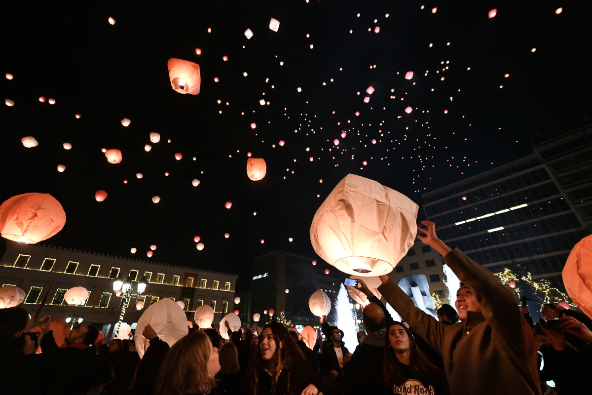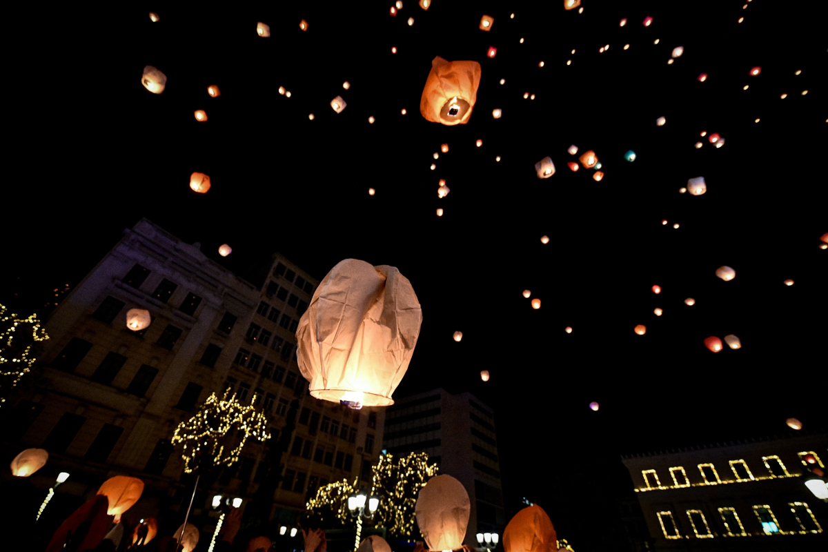 Μπροστά από το Δημαρχείο της Αθήνας, σε χριστουγεννιάτικο σκηνικό, μικροί και μεγάλοι άναψαν περισσότερα από 1.500 βιοδιασπώμενα φαναράκια και τα άφησαν να ανέβουν ψηλά στον ουρανό, μαζί με τις ευχές τους για ένα καλύτερο αύριο, γεμάτο υγεία, αγάπη και ελπίδα.