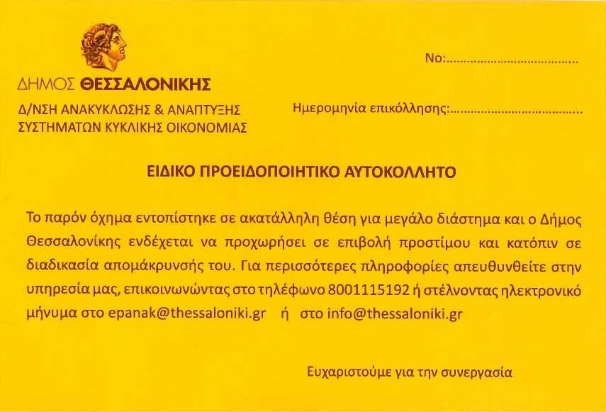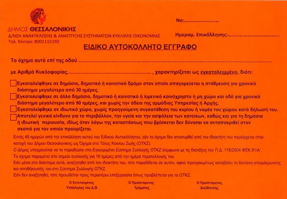 Ο Δήμος Θεσσαλονίκης καλεί τους πολίτες να συνεργαστούν και να υποστηρίξουν την πρωτοβουλία, ενημερώνοντας για τυχόν εγκαταλειμμένα οχήματα στις γειτονιές τους και ακολουθώντας τις οδηγίες των αρμόδιων αρχών. Παράλληλα, εισάγει νέο τρόπο ειδοποίησης προς τους δημότες που αφήνουν τα οχήματα τους οπουδήποτε. Εφεξής, σε κάθε καταγγελία που θα γίνεται από δημότες ή από τους επόπτες-ελεγκτές ο Δήμος θα προειδοποιεί τον ιδιοκτήτη με ένα ΝΕΟ πορτοκαλί προειδοποιητικό αυτοκόλλητο όπου θα επισημαίνεται ότι ο Δήμος έχει μπει στην διαδικασία ενημέρωσης του κατόχου να αποσύρει το αυτοκίνητό του για να μην χαρακτηρισθεί εγκαταλειμμένο.