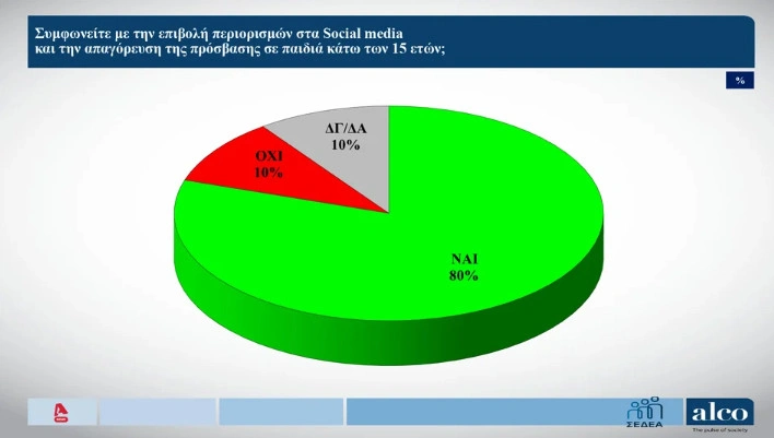 Η συντριπτική πλειοψηφία των ερωτηθέντων (80%) συμφωνεί με την επιβολή περιορισμών στα sosial media και την απαγόρευση της πρόσβασης σε παιδιά κάτω των 15 ετών.