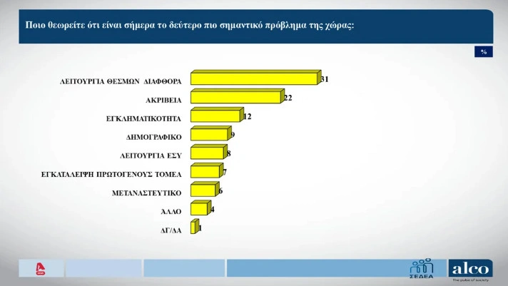 Από εκεί και πέρα, το δεύτερο πιο σημαντικό πρόβλημα αποτελεί η λειτουργία των θεσμών και η διαφθορά, ενώ ακολουθεί η εγκληματικότητα, σύμφωνα με τη δημοσκόπηση.