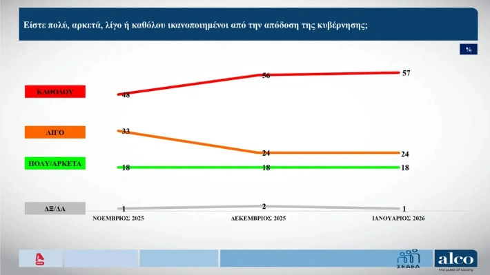 Για την αποδοτικότητα της κυβέρνησης, το 57% των πολιτών δηλώνει καθόλου ικανοποιημένο, το 24% λίγο και μόνο το 18% πολύ ή αρκετά: