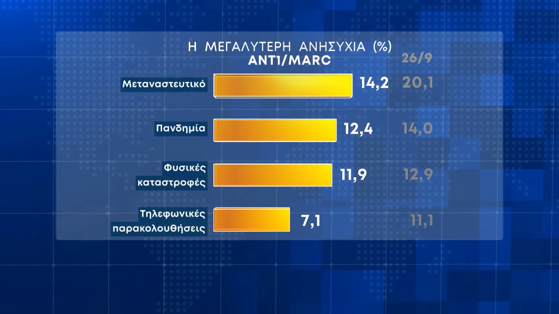 Σύμφωνα με την έρευνα, το 84,5% των πολιτών ανησυχεί για την ακρίβεια. Ακολουθούν τα εθνικά θέματα με ποσοστό 44,1%, η εγκληματικότητα με 37,8%, ο πόλεμος στην Ουκρανία με 34%, το μεταναστευτικό με 14,2%, η πανδημία με 12,4%, οι φυσικές καταστροφές με 11,9% και οι τηλεφωνικές παρακολουθήσεις με 7,1%.