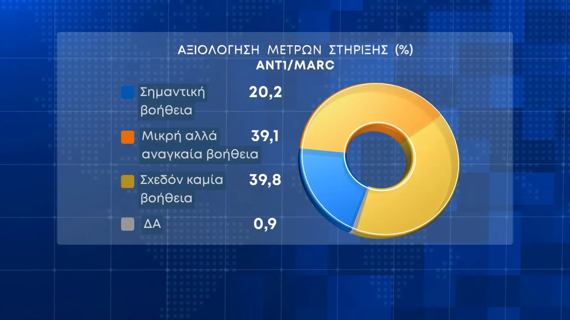 Όσον αφορά τα μέτρα στήριξης που έχει λάβει η κυβέρνηση, το 39,8% θεωρεί πως είναι «σχεδόν καμία βοήθεια», το 39,1% «μικρή, αλλά αναγκαία βοήθεια» και το 20,2% «σημαντική βοήθεια».