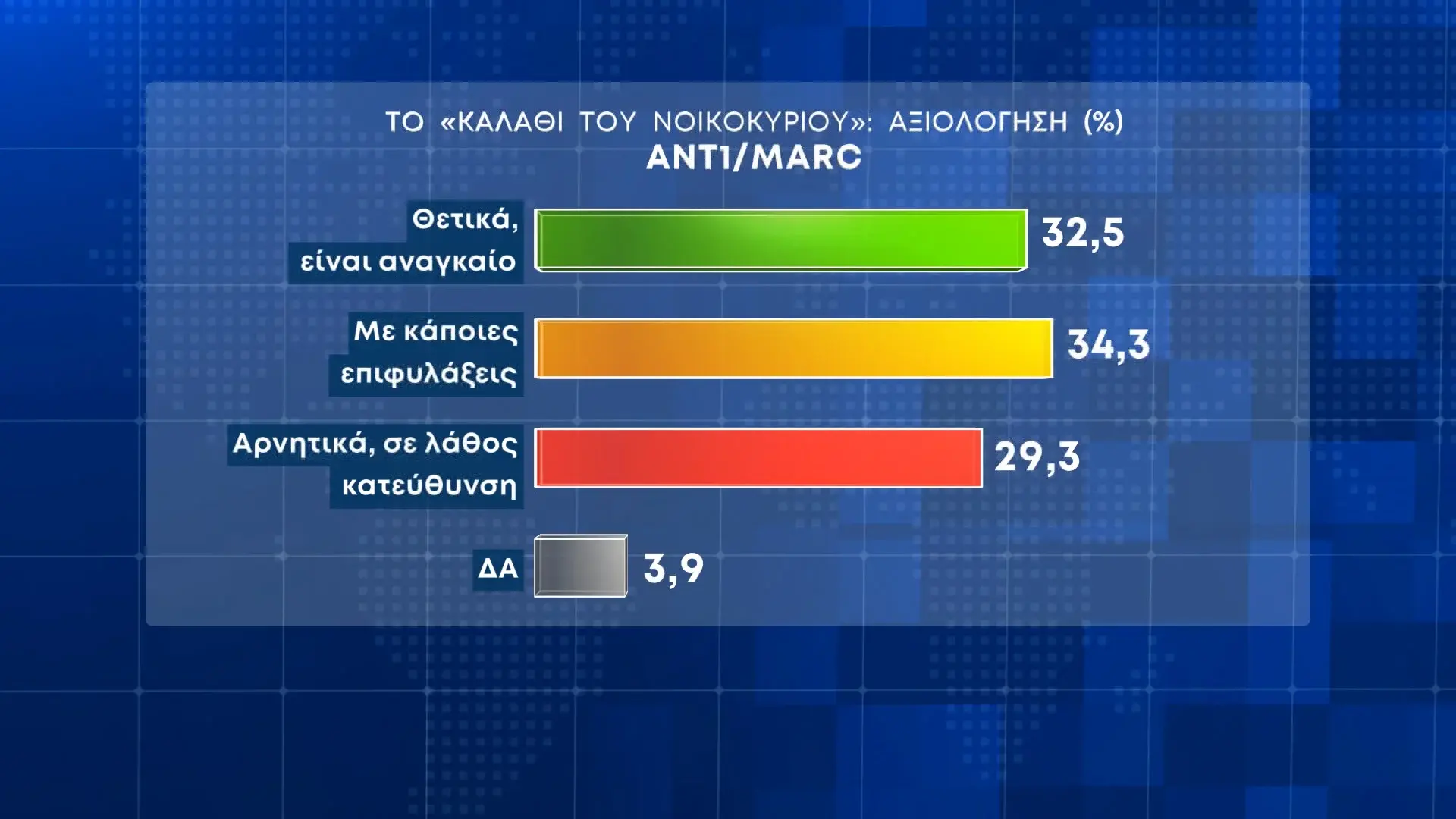 Το 34,3% των πολιτών που συμμετείχαν στην αντίστοιχη έρευνα βλέπει με επιφυλάξεις το «καλάθι του νοικοκυριού», ενώ το 32,5% το κρίνει θετικά, ως «αναγκαίο». Το 29,3% των ερωτηθέντων το αξιολογεί αρνητικά, «σε λάθος κατεύθυνση».