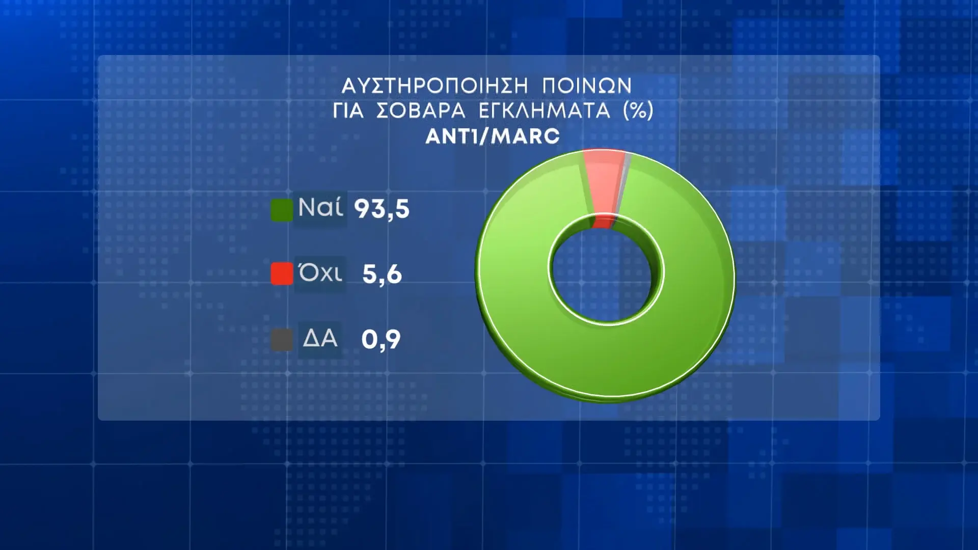 Σε ό,τι αφορά τα σοβαρά εγκλήματα, η συντριπτική πλειοψηφία των συμμετεχόντων στην έρευνα ζητεί αυστηροποίηση των ποινών σε ποσοστό 93,5%. Όχι, απαντά το 5,6%.