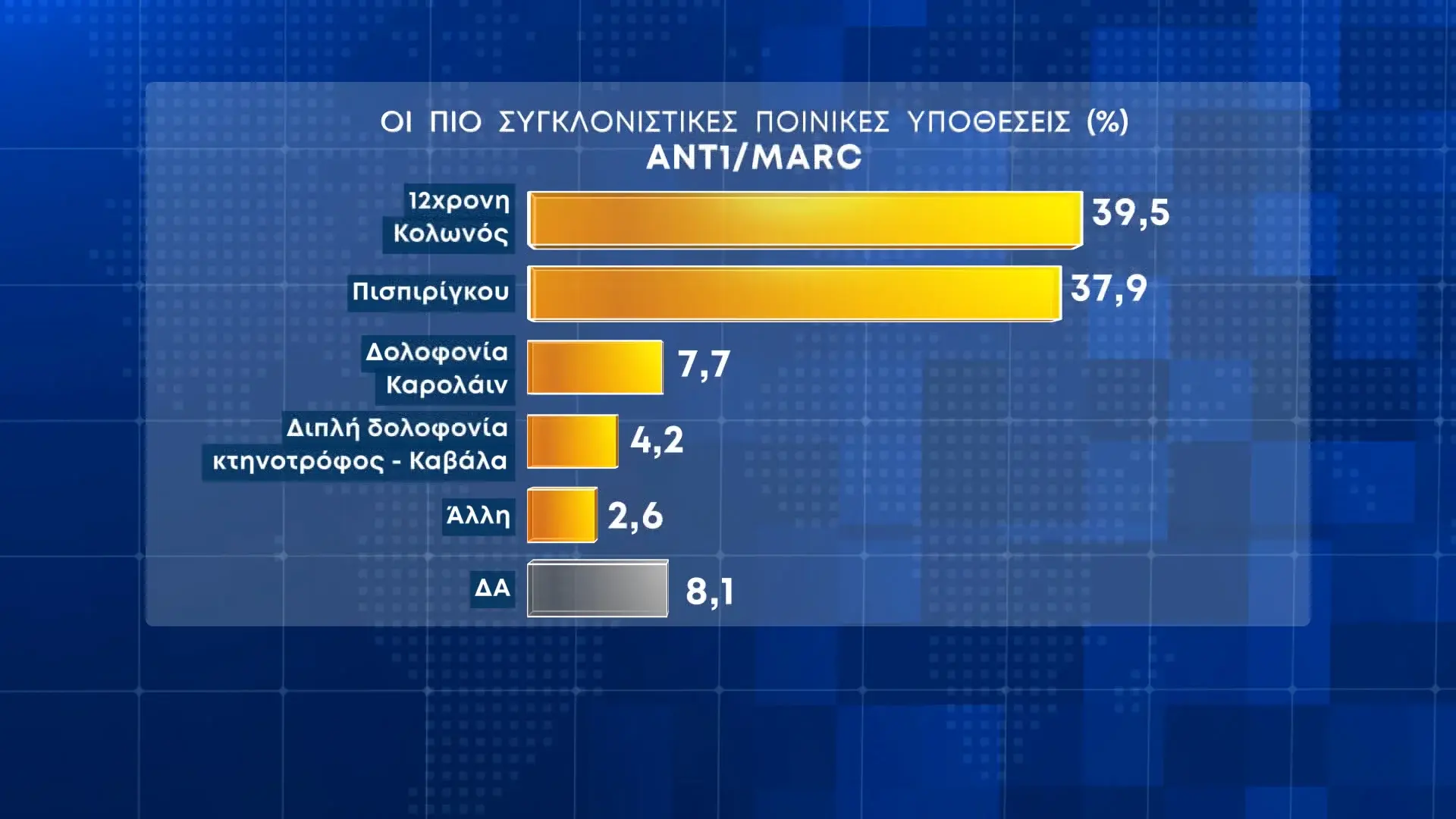 Η υπόθεση βιασμού και εκπόρνευσης της 12χρονης στον Κολωνό θεωρείται από τους ερωτηθέντες ως η πιο συγκλονιστική ποινική υπόθεση (ποσοστό 39,5%), ενώ ακολουθούν η υπόθεση του θανάτου των τριών παιδιών της Ρούλας Πισπιρίγκου και του Μάνου Δασκαλάκη στην Πάτρα (37,9%), η δολοφονία της Καρολάιν από τον Μπάμπη Αναγνωστόπουλο (7,7%) και η διπλή δολοφονία στην Καβάλα (4,2%).