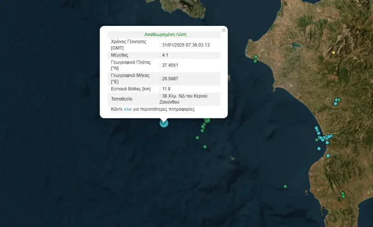 Σύμφωνα με το Γεωδυναμικό Ινστιτούτου Αθηνών, ο πρώτος σεισμός ήταν 4,1 Ρίχτερ και εντοπίζεται 25 χιλιόμετρα Νοτιοδυτικά του Κεριού Ζακύνθου και το εστιακό βάθος υπολογίζεται στα 10 χιλιόμετρα.
