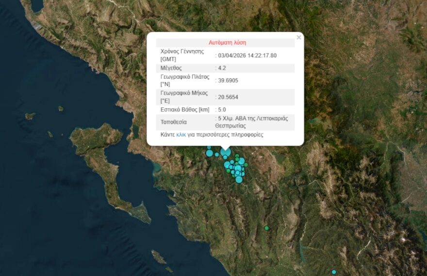 «H σεισμική δράση δυτικά των Ιωαννίνων συνεχίζεται εντατικά. Σεισμός προκαταρκτικού μεγέθους Μ4.5 έγινε έντονα αισθητός πριν από λίγα λεπτά, στις 17:22. Μάλλον πρόκειται για μετασεισμό του ισχυρού σεισμού με Μ5.3 στις 8 Μαρτίου».