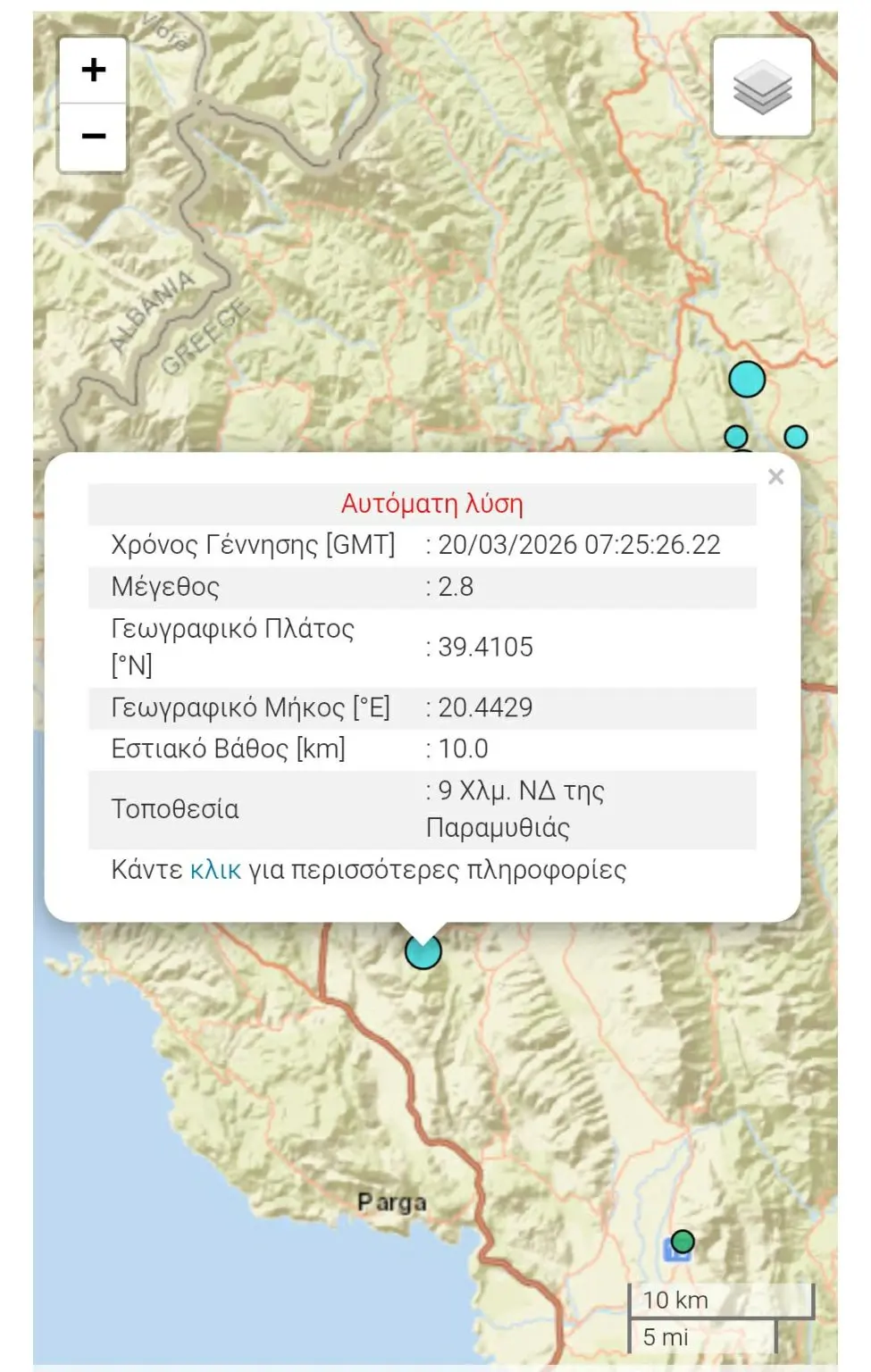 Και στις 09:25:26, ακολούθησε δεύτερη δόνηση μεγέθους 2,8 Ρίχτερ, επίσης με εστιακό βάθος 10 χιλιομέτρων, με επίκεντρο 9 χιλιόμετρα νοτιοδυτικά της Παραμυθιάς.