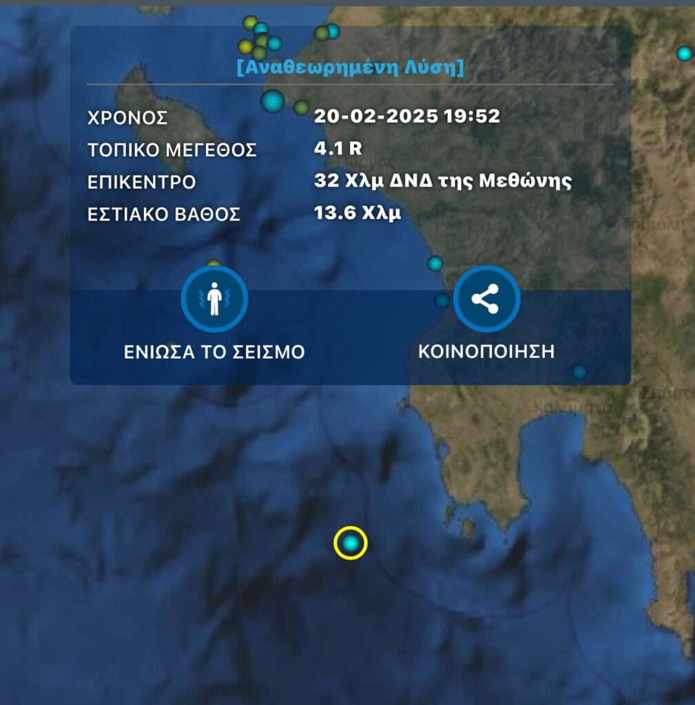 Η δόνηση, σύμφωνα με το Γεωδυναμικό Ινστιτούτο Αθηνών, είχε επίκεντρο στη θαλάσσια περιοχή 32 χιλιόμετρα δυτικά νοτιοδυτικά της Μεθώνης, εστιακό βάθος 13,6 χιλιόμετρα και αισθητή στη Μεσσηνία.