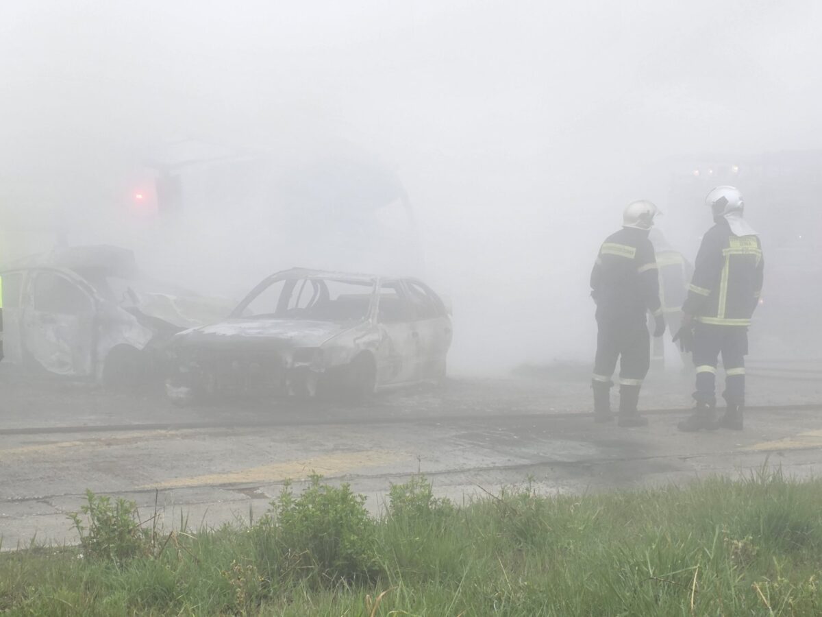 Εκείνη τη στιγμή ο οδηγός ενός δεύτερου αυτοκίνητο που ακολουθούσε, δεν πρόλαβε να δει λόγω της ομίχλης το άλλο αυτοκίνητο και να φρενάρει με αποτέλεσμα να πέσει πάνω του. Από τη σύγκρουση ξέσπασε αμέσως φωτιά και δύο άνθρωποι που επέβαιναν σε αυτά τα δύο αυτοκίνητα απανθρακώθηκαν. Λίγα λεπτά αργότερα, η νταλίκα που ακολουθούσε τα δύο αυτοκίνητα που είχαν ήδη συγκρουστεί έπεσε πάνω τους για να καταλήξει στο κουβούκλιο των διοδίων και να τυλιχτεί και αυτή στις φλόγες.