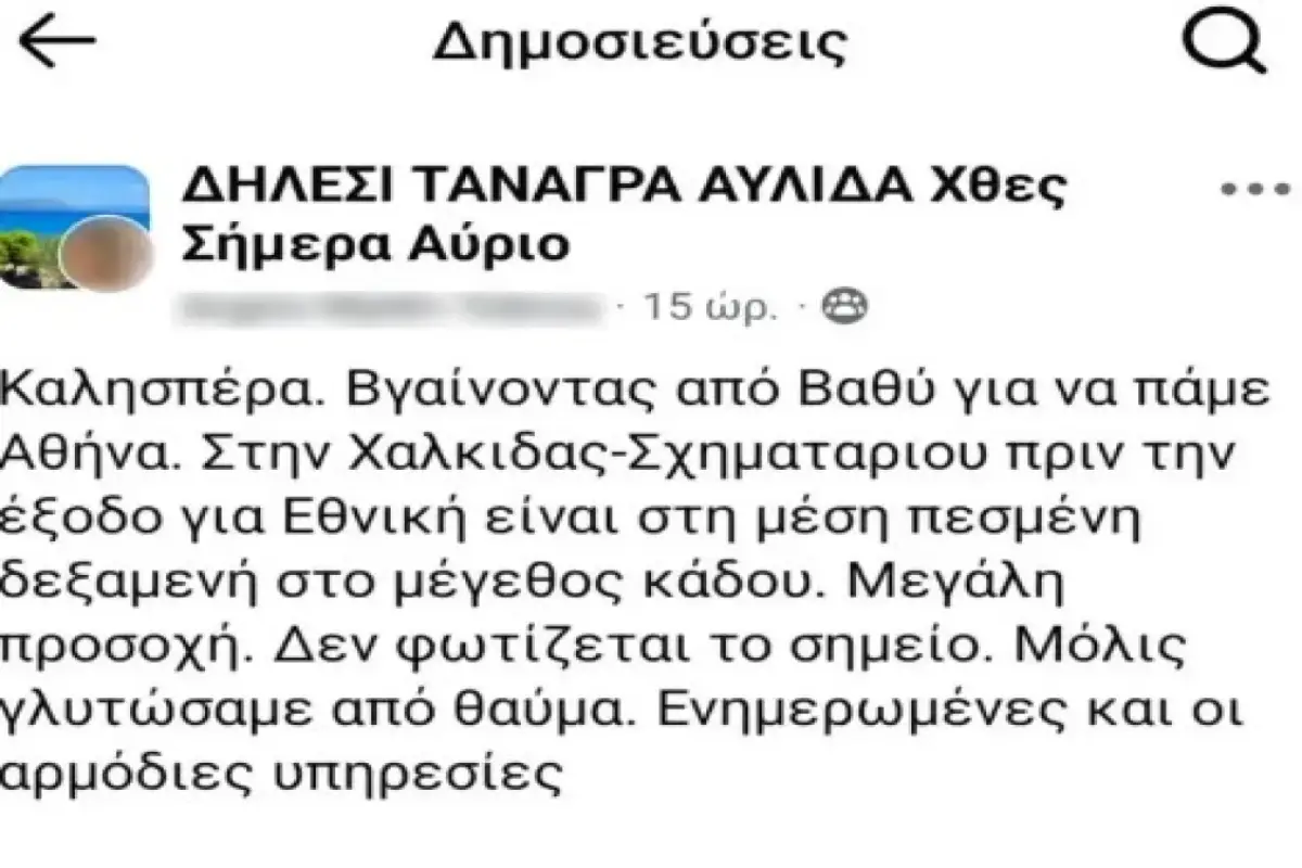 Λίγη ώρα πριν το δυστύχημα, είχε γίνει ανάρτηση σε ομάδα στο Facebook με όνομα «Ειδήσεις από το Δήλεσι, την Τανάγρα και την Αυλίδα«, στην οποία γυναίκα προειδοποιούσε ότι έπεσε «δεξαμενή νερού στη Χαλκίδος – Σχηματαρίου».