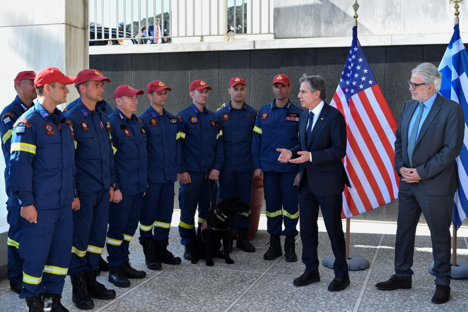Παρουσία του υπουργού Κλιματικής Κρίσης και Πολιτικής Προστασίας Χρήστου Στυλιανίδη και συνοδευόμενος από τον πρεσβευτή των ΗΠΑ στην Ελλάδα Τζορτζ Τσούνη, ο Άντονι Μπλίνκεν ευχαρίστησε τα μέλη της ΕΜΑΚ και του ΕΚΑΒ για τη συμβολή τους στο να σωθούν ανθρώπινες ζωές και εξέφρασε την ευγνωμοσύνη του για το έργο που προσφέρουν.