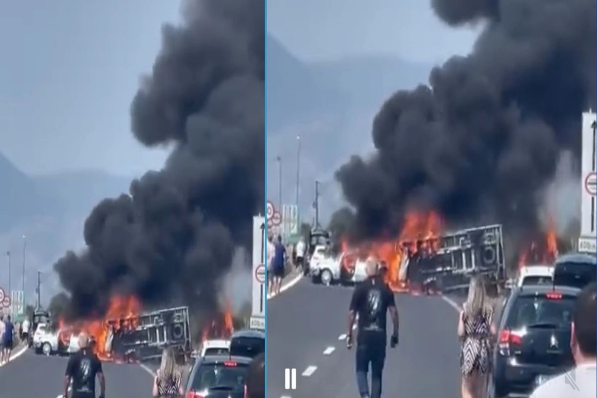 Από τη σφοδρή σύγκρουση εκδηλώθηκε πυρκαγιά, με τρεις ανθρώπους να απανθρακώνονται και μία γυναίκα να τραυματίζεται σοβαρά. Το αυτοκίνητο που τυλίχτηκε στις φλόγες παρέσυρε στη συνέχεια και δεύτερο όχημα, στο οποίο επέβαιναν τέσσερα άτομα, συγγενείς των θυμάτων, που όμως πρόλαβαν να εγκαταλείψουν το αυτοκίνητο εγκαίρως.