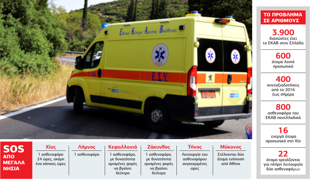 Η περίπτωση της Χίου είναι, όμως, μέρος ενός ευρύτερου προβλήματος που αφορά ιδιαίτερα στα νησιά. Είναι χαρακτηριστικό ότι σε 50 περιοχές της χώρας λειτουργεί μόλις ένα ασθενοφόρο. Η Κεφαλλονιά και η Ζάκυνθος αποτελούν δύο παραδείγματα, καθώς πρόκειται, επίσης, για μεγάλα νησιά. Παρ’ όλα αυτά, έχουν από ένα ασθενοφόρο και ορισμένες φορές βγαίνει και δεύτερο.
