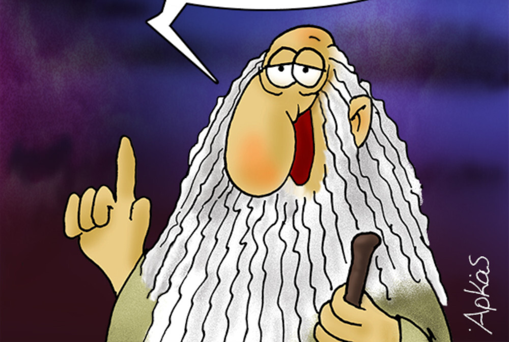 Στο σκίτσο βλέπουμε τον σοφό να λέει στον Έλληνα ψηφοφόρο την ώρα που βρίσκεται στο παραβάν πως