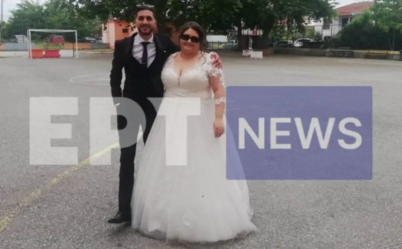 Η νύφη με το νυφικό της και ο γαμπρός με το κοστούμι που παντρεύτηκαν το Σάββατο (20/5) έβγαλαν φωτογραφία στην αυλή του εκλογικού κέντρου αγκαλιασμένοι.