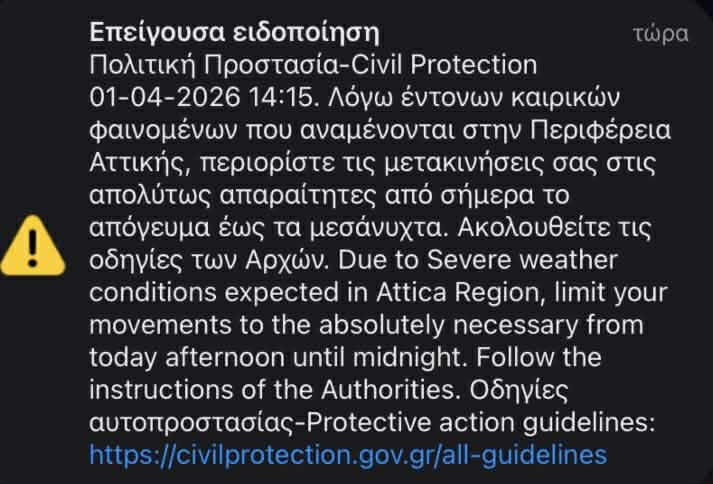 Μήνυμα μέσω του 112 εστάλη σε κατοίκους της Αττικής καλώντας τους να περιορίσουν τις μετακινήσεις τους στις απολύτως απαραίτητες, από σήμερα το απόγευμα έως τα μεσάνυχτα, ενόψει των έντονων καιρικών φαινομένων. Συγκεκριμένα το μήνυμα αναφέρει: «Λόγω έντονων καιρικών φαινομένων που αναμένονται στην Περιφέρεια Αττικής περιορίστε τις μετακινήσεις σας στις απολύτως απαραίτητες από σήμερα το απόγευμα έως τα μεσάνυχτα. Ακολουθείτε τις οδηγίες των Αρχών».