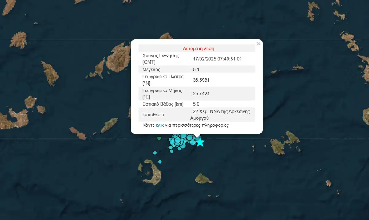 Ο σεισμός είχε επίκεντρο τις Κυκλάδες και συγκεκριμένα την θαλάσσια περιοχή ανάμεσα στην Αμοργό και την Σαντορίνη με ακριβή τοποθεσία 23 χλμ. ΝΝΔ της Αμοργού.