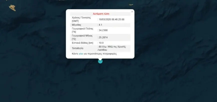 Σύμφωνα με το Γεωδυναμικό Ινστιτούτο ο σεισμός είχε μέγεθος 4,1 της κλίμακας Ρίχτερ και είχε επίκεντρο 80 χιλιόμετρα Νότια – Νοτιοδυτικά της Χρυσής Λασιθίου.