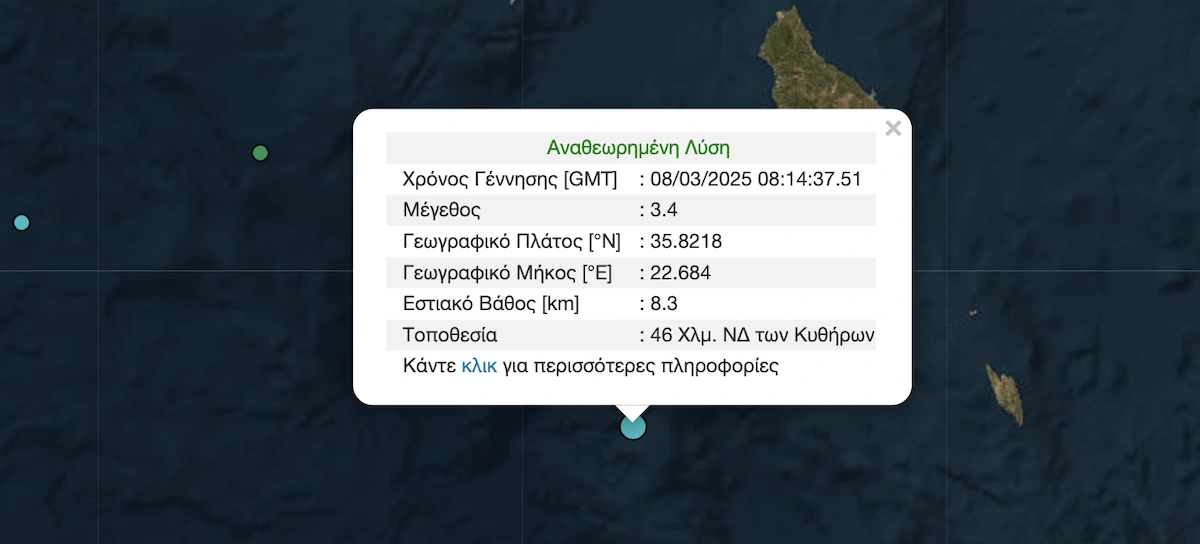 Συγκεκριμένα, σύμφωνα με την αναθεωρημένη λύση του Γεωδυναμικού Ινστιτούτου, ο σεισμός καταγράφηκε στις 10:14 π.μ., με το επίκεντρο να εντοπίζεται 48 χιλιόμετρα νοτιοδυτικά των Κυθήρων, δηλαδή στην ευρύτερη περιοχή των Αντικυθήρων. Το εστιακό βάθος του σεισμού στα Αντικύθηρα υπολογίστηκε σε 8,3 χιλιόμετρα, σύμφωνα με το Γεωδυναμικό Ινστιτούτο.