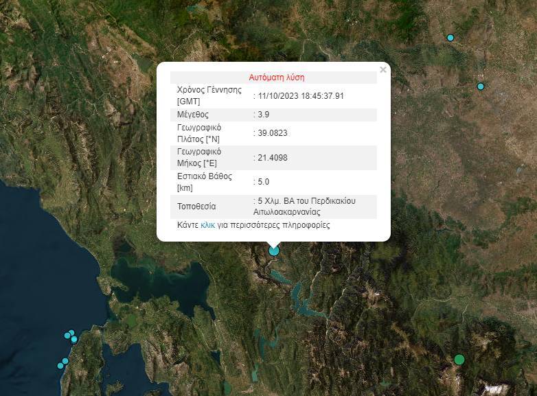 Ο σεισμός εντοπίζεται στα 5 Χλμ. ΒΑ του Περδικακίου Αιτωλοακαρνανίας, με εστιακό βάθος στα 5 χλμ.