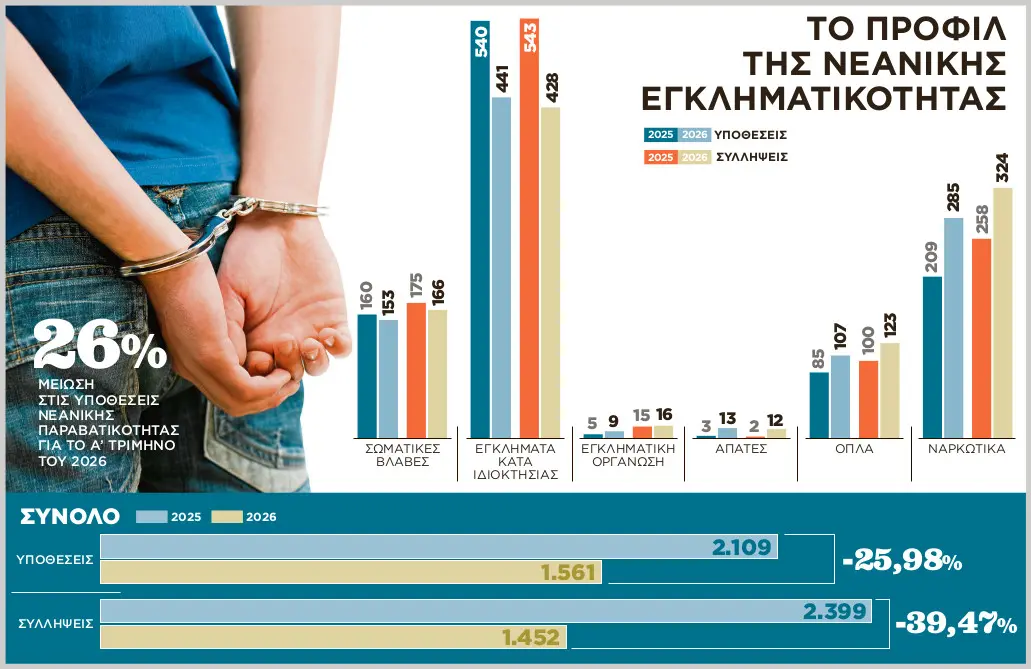 Συνολικά, τον Ιανουάριο, τον Φεβρουάριο και τον Μάρτιο, οι αρμόδιες υπηρεσίες της ΕΛ.ΑΣ. σε όλη τη χώρα υποδέχθηκαν 1.561 υποθέσεις και προχώρησαν σε 1.452 συλλήψεις ανηλίκων. Σε σύγκριση με το πρώτο τρίμηνο του 2025, οι υποθέσεις μειώθηκαν κατά 548 (-26%) και οι συλλήψεις κατά 947 (-39%).