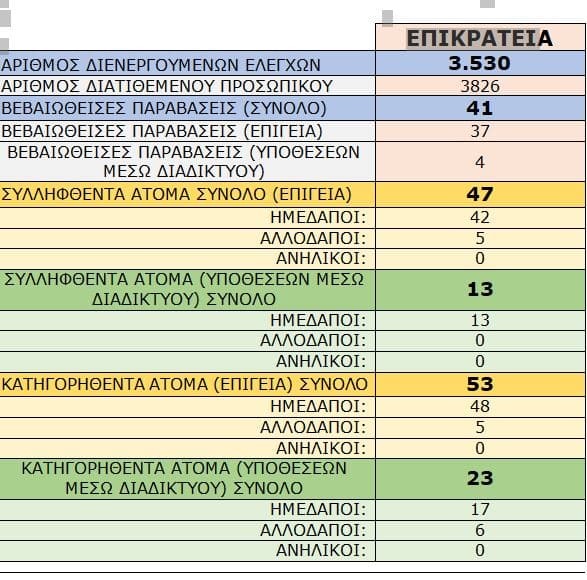 Συγκεκριμένα, πραγματοποιήθηκαν 3.530 έλεγχοι, στο πλαίσιο των οποίων βεβαιώθηκαν 41 παραβάσεις και συνελήφθησαν 60 άτομα, ενώ στις δικογραφίες που σχηματίστηκαν περιλαμβάνονται επιπλέον 16 άτομα.