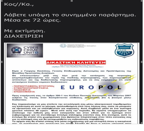 Στη συγκεκριμένη περίπτωση οι δράστες στην προσπάθειά τους να εξαπατήσουν συμπολίτες μας – χρήστες του διαδικτύου χρησιμοποιούν τα στοιχεία του Γενικού Επιθεωρητή Αστυνομίας Νοτίου Ελλάδας, Αντιστράτηγου Γεώργιου Κανέλλου, σε επιστολή που φέρει λογότυπα της Διεύθυνσης Δίωξης Ηλεκτρονικού Εγκλήματος, του Υπουργείου Δικαιοσύνης και ενημερωτικού ιστότοπου, επιχειρώντας να δημιουργήσουν την εντύπωση ότι προέρχεται από την Ελληνική Αστυνομία.