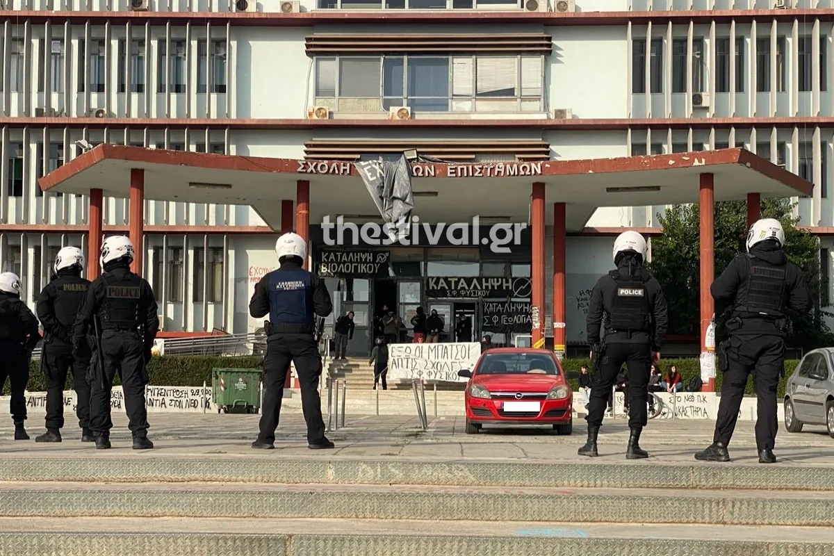 Ομάδα ατόμων που βρίσκεται εντός της Σχολής Θετικών Επιστημών, έχει βγει στην είσοδο της ΣΘΕ κρατώντας πανό και φωνάζοντας συνθήματα, ζητώντας την απομάκρυνση των αστυνομικών δυνάμεων από το campus.