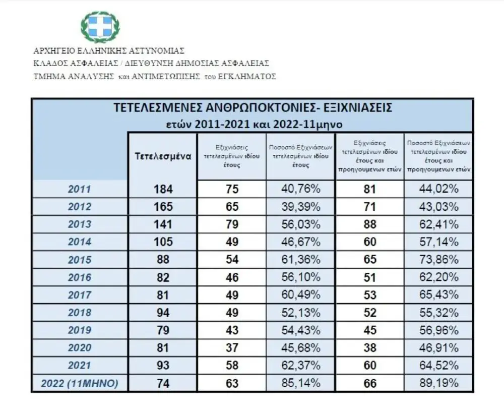Σύμφωνα με τα στοιχεία, το 2022 στην Ελλάδα καταγράφηκαν 74 δολοφονίες, οι λιγότερες που έχουν γίνει την τελευταία δεκαετία. Το ίδιο ισχύει και για τον αριθμό των ανθρωποκτονιών που έχουν εξιχνιαστεί με το ποσοστό να αγγίζει το 90%, το υψηλότερο από το 2011, όπως φαίνεται στον πίνακα που ακολουθεί:
