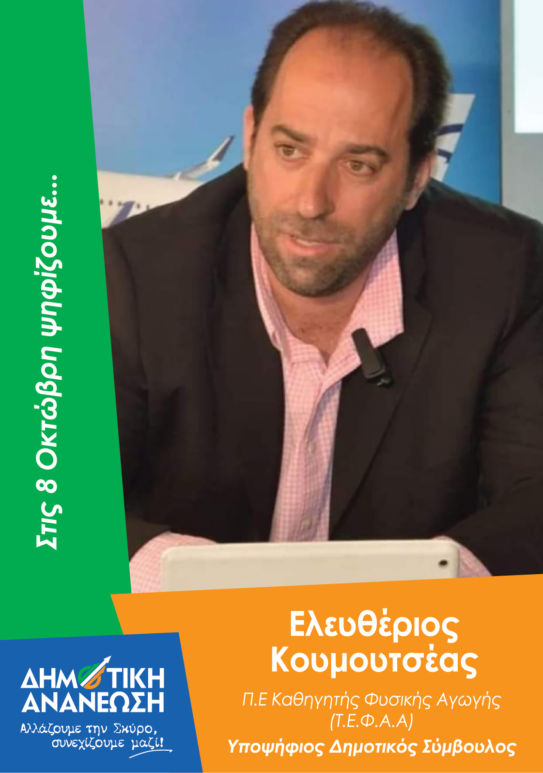 Ο Ελευθέριος Κουμουτσέας που είναι υποψήφιος με τον δήμαρχο Νίκο Μαυρίκου στο μήνυμα του προς τους πολίτες της Σκύρου αναφέρει: «Αγαπητοί συμπολίτες και αυτή τη φορά θέτω στην κρίση σας την υποψηφιότητά μου, και ζητώ τη στήριξή σας στις εκλογές της 8ης Οκτωβρίου του επιτυχημένου δημάρχου μας Νίκου Μαυρίκου.