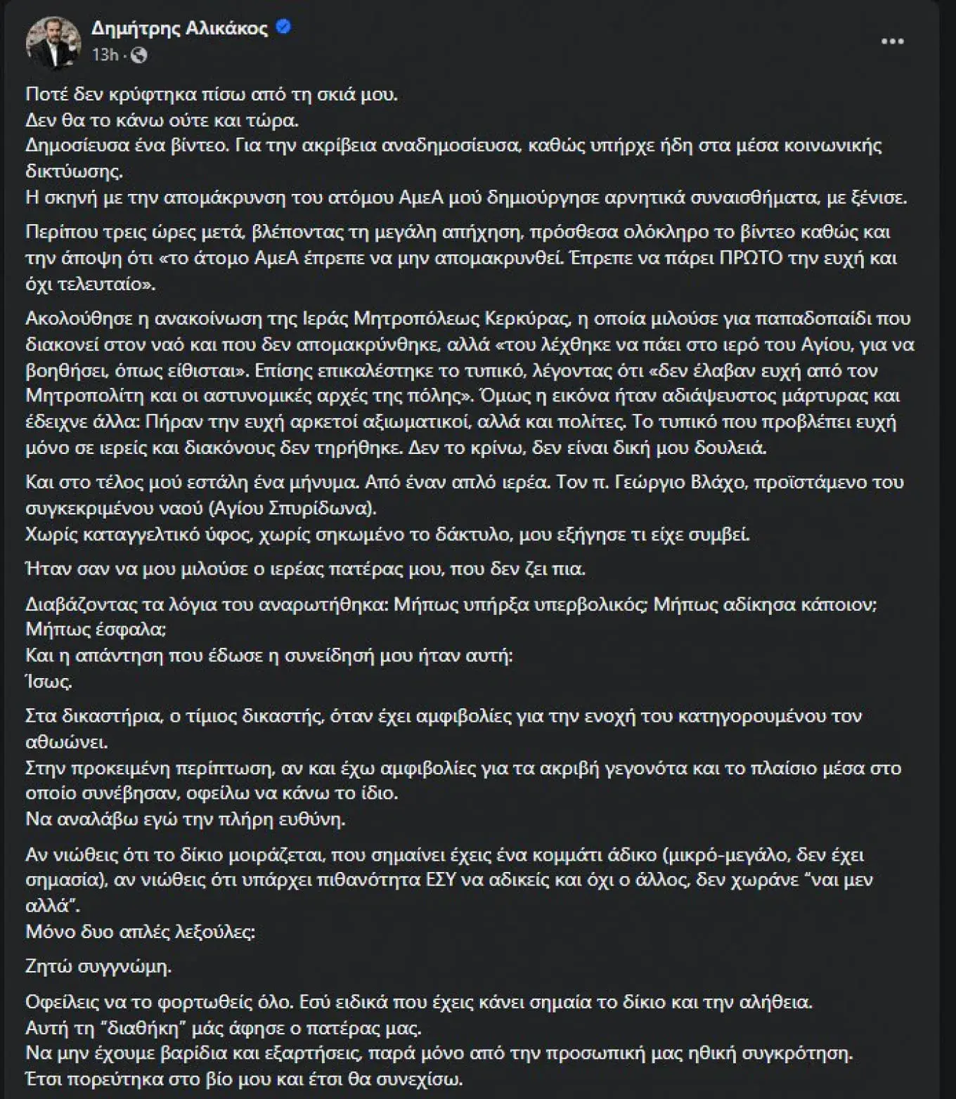 Στην ανάρτησή του ο Δημήτρης Αλικάκος περιγράφει ότι αυτό που τον έπεισε ότι έκανε λάθος ήταν το τηλεφώνημα από τον προϊστάμενο του ναού του Αγίου Σπυρίδωνα, ο οποίος «χωρίς καταγγελτικό ύφος, χωρίς σηκωμένο το δάκτυλο, μου εξήγησε τι είχε συμβεί».