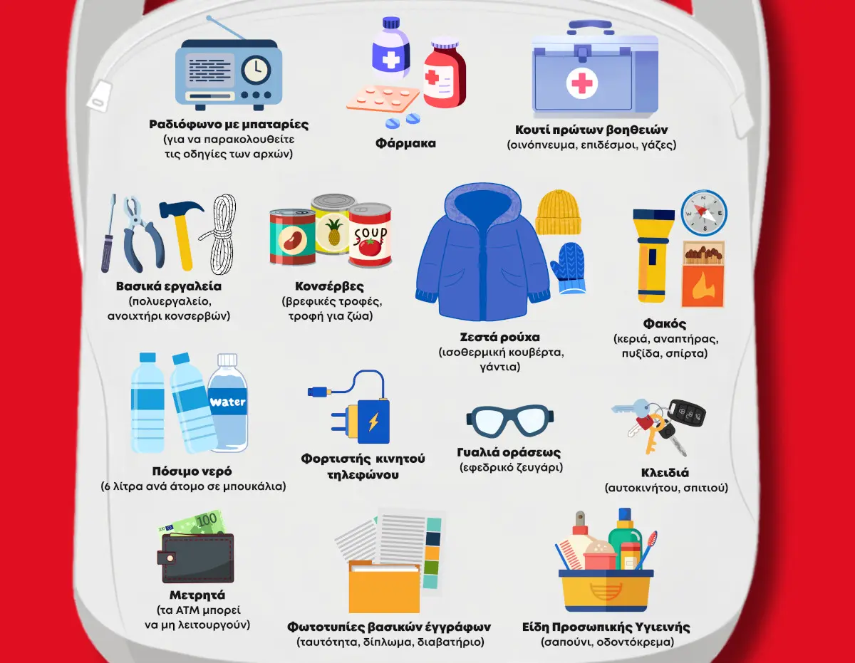 - Ραδιόφωνο με μπαταρίες (και εφεδρικές μπαταρίες) για να παρακολουθείτε τις οδηγίες των αρχών.