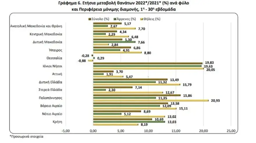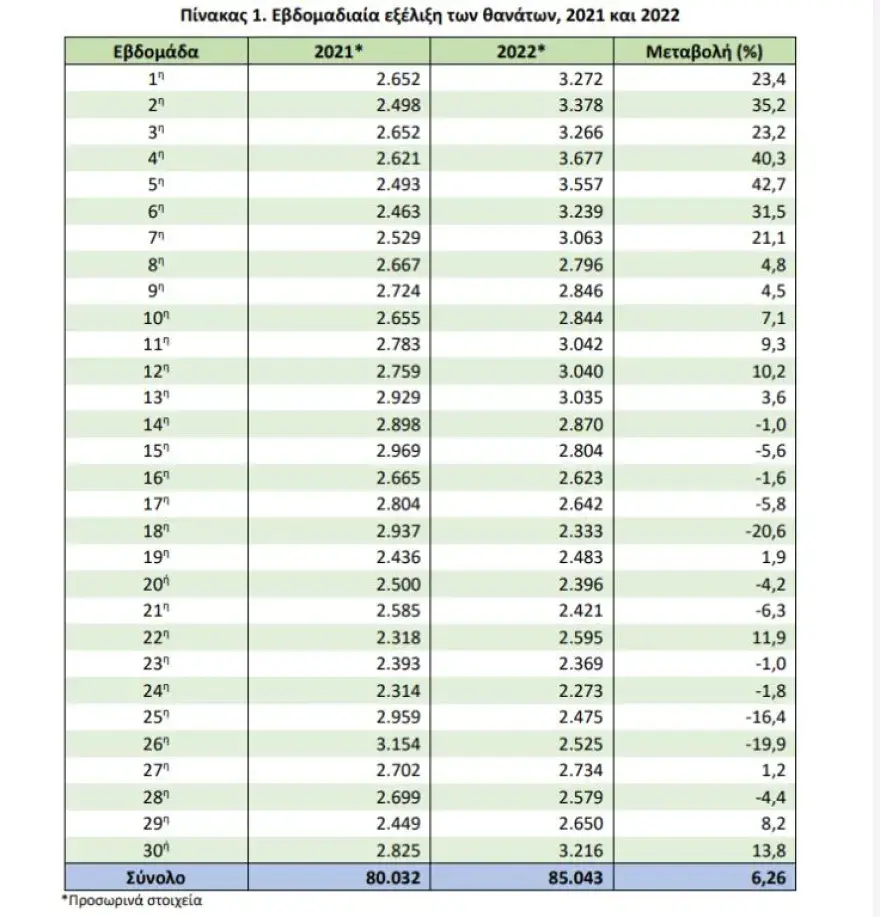Αύξηση κατά 11.359 θανάτους (15,42%) σημειώθηκε σε σχέση με το μέσο όρο των πρώτων τριάντα (30) εβδομάδων των ετών της εξαετίας 2016 – 2021 (73.684 θάνατοι).