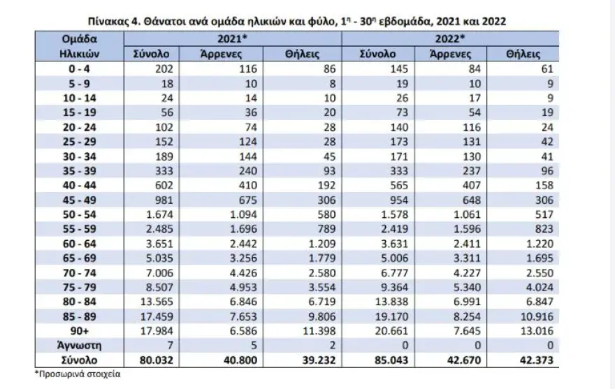 Οι θάνατοι στην Ελλάδα κατά τις πρώτες τριάντα εβδομάδες του 2022 (3/1/2022 – 31/7/2022) ανήλθαν σε 85.043 (42.670 άνδρες και 42.373 γυναίκες).