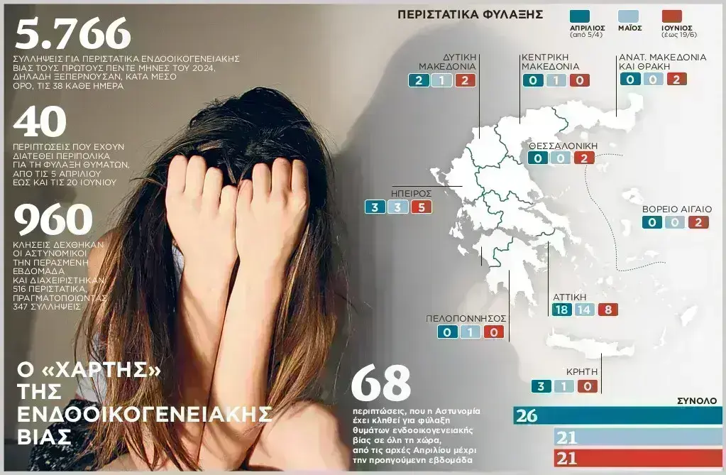 Κι αν ο αριθμός των περιπτώσεων φύλαξης θυμάτων αυξάνεται σημαντικά, οι στατιστικές αποτελούν… σταγόνα στον ωκεανό, σε σύγκριση με τις υποθέσεις που διαχειρίζονται καθημερινά τα 63 Γραφεία Ενδοοικογενειακής Βίας, σε όλη την Ελλάδα. Είναι ενδεικτικό ότι, σύμφωνα με τις επίσημες καταγραφές της ΕΛ.ΑΣ., μόνο τους πρώτους πέντε μήνες του 2024 υπήρξαν 5.766 συλλήψεις για περιστατικά ενδοοικογενειακής βίας. Κατά μέσο όρο, ξεπερνούσαν τις 38 κάθε ημέρα του έτους. Το ίδιο διάστημα, ο αριθμός των υποθέσεων εκτοξεύτηκε κατά 67%, σε σύγκριση με το πρώτο πεντάμηνο του 2023!