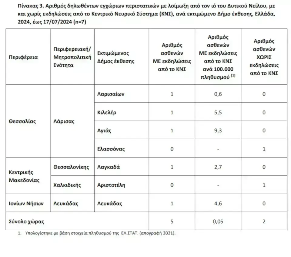 Σύμφωνα με την εβδομαδιαία έκθεση επιδημιολογικής επιτήρησης του ΕΟΔΥ, από τους συνολικά 7 ανθρώπους που έχουν νοσήσει αυτήν την καλοκαιρινή περίοδο από τον ιό του Δυτικού Νείλου μετά από τσίμπημα κουνουπιού, οι πέντε εμφάνισαν βαρύτερα συμπτώματα από το Κεντρικό Νευρικό Σύστημα (ΚΝΣ) και συγκεκριμένα, εγκεφαλίτιδα ή /και μηνιγγίτιδα, ή /και οξεία χαλαρή παράλυση).