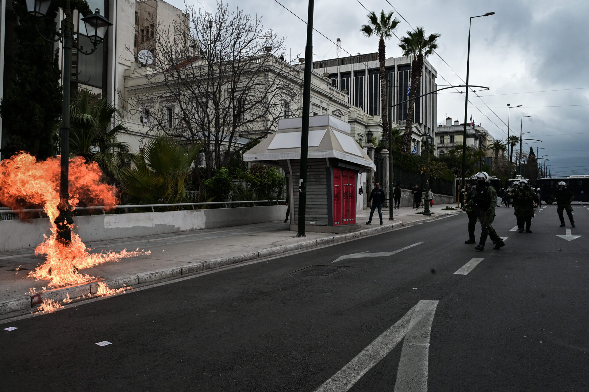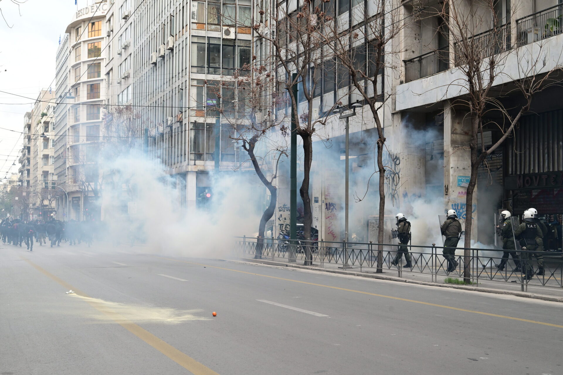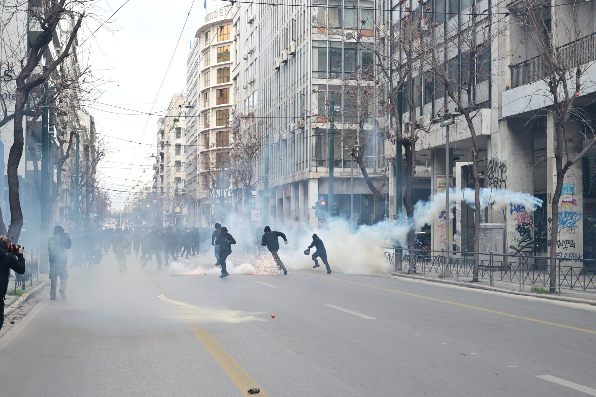 Επεισόδια σημειώθηκαν κατά τη διάρκεια της πορείας, μετά την απεργιακή συγκέντρωση της ΑΔΕΔΥ και εργατικών σωματείων, με αφορμή τον έναν χρόνο από το πολύνεκρο σιδηροδρομικό δυστύχημα των Τεμπών.
