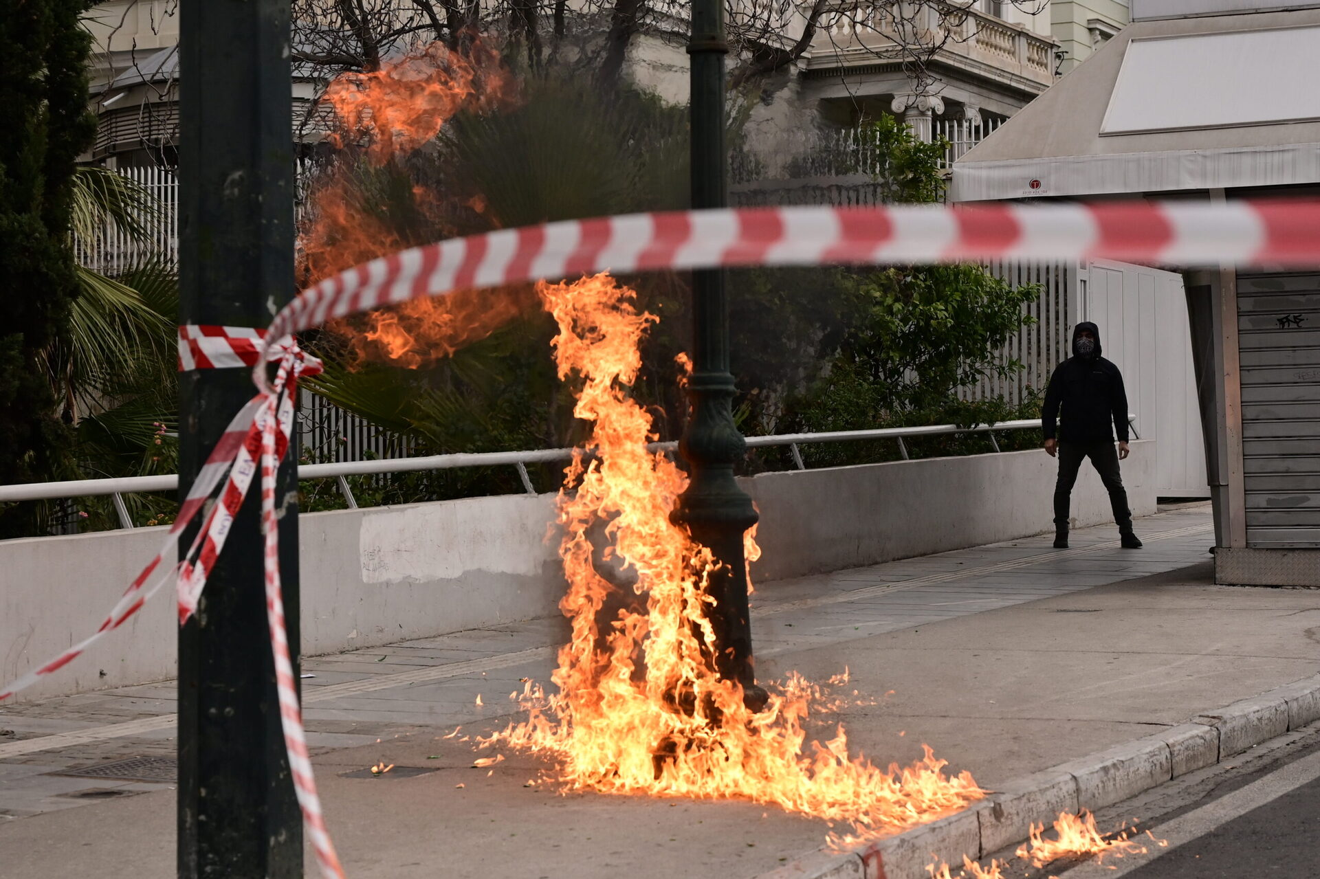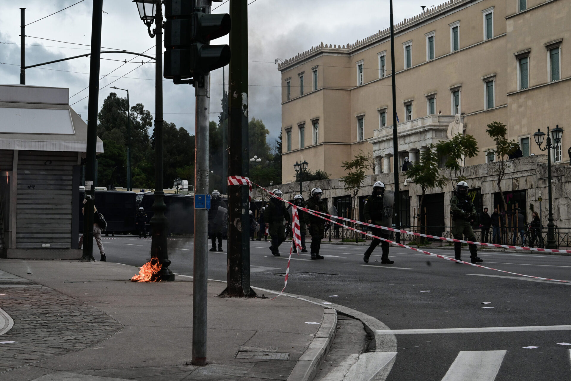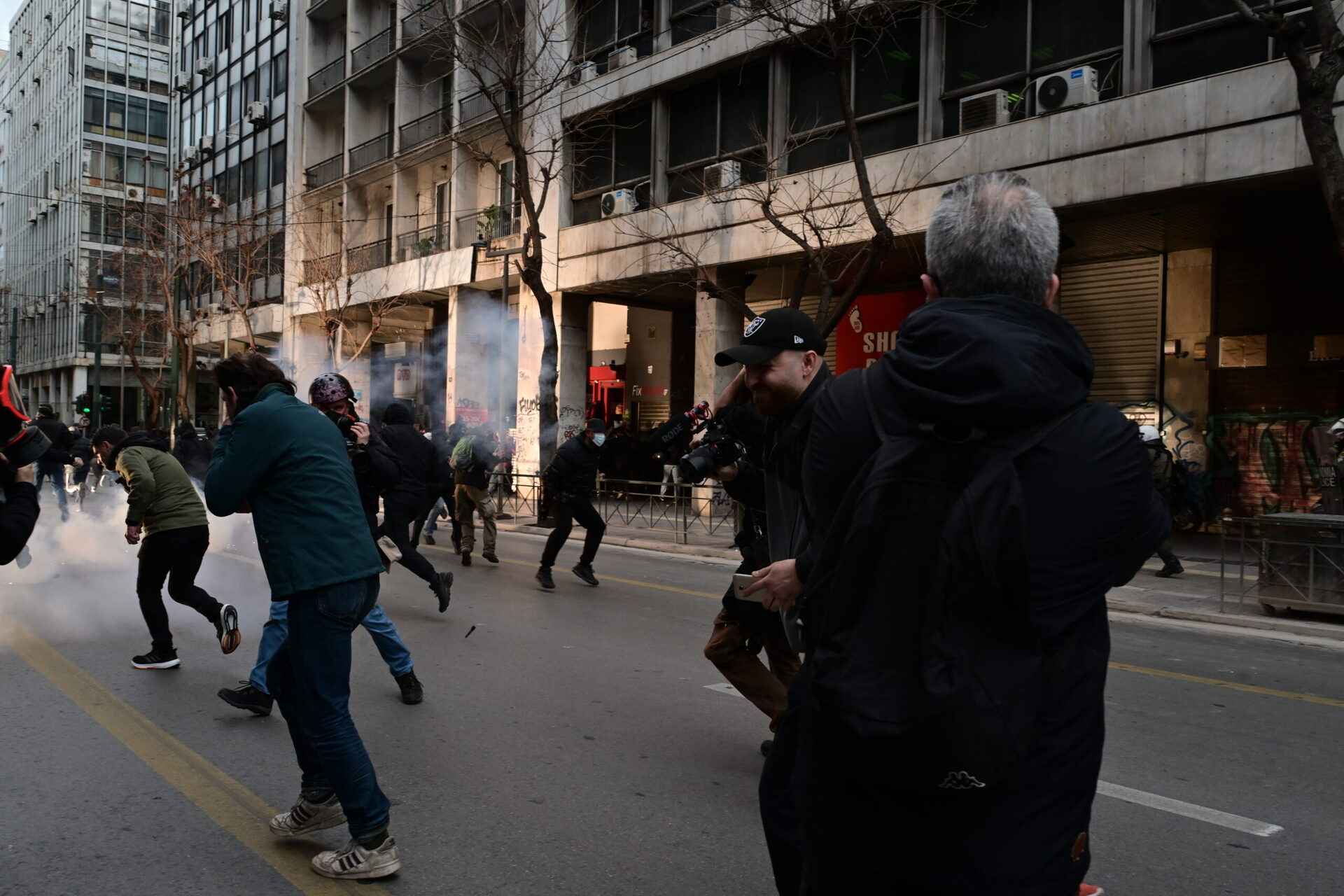 Επεισόδια σημειώθηκαν κατά τη διάρκεια της πορείας, μετά την απεργιακή συγκέντρωση της ΑΔΕΔΥ και εργατικών σωματείων, με αφορμή τον έναν χρόνο από το πολύνεκρο σιδηροδρομικό δυστύχημα των Τεμπών.