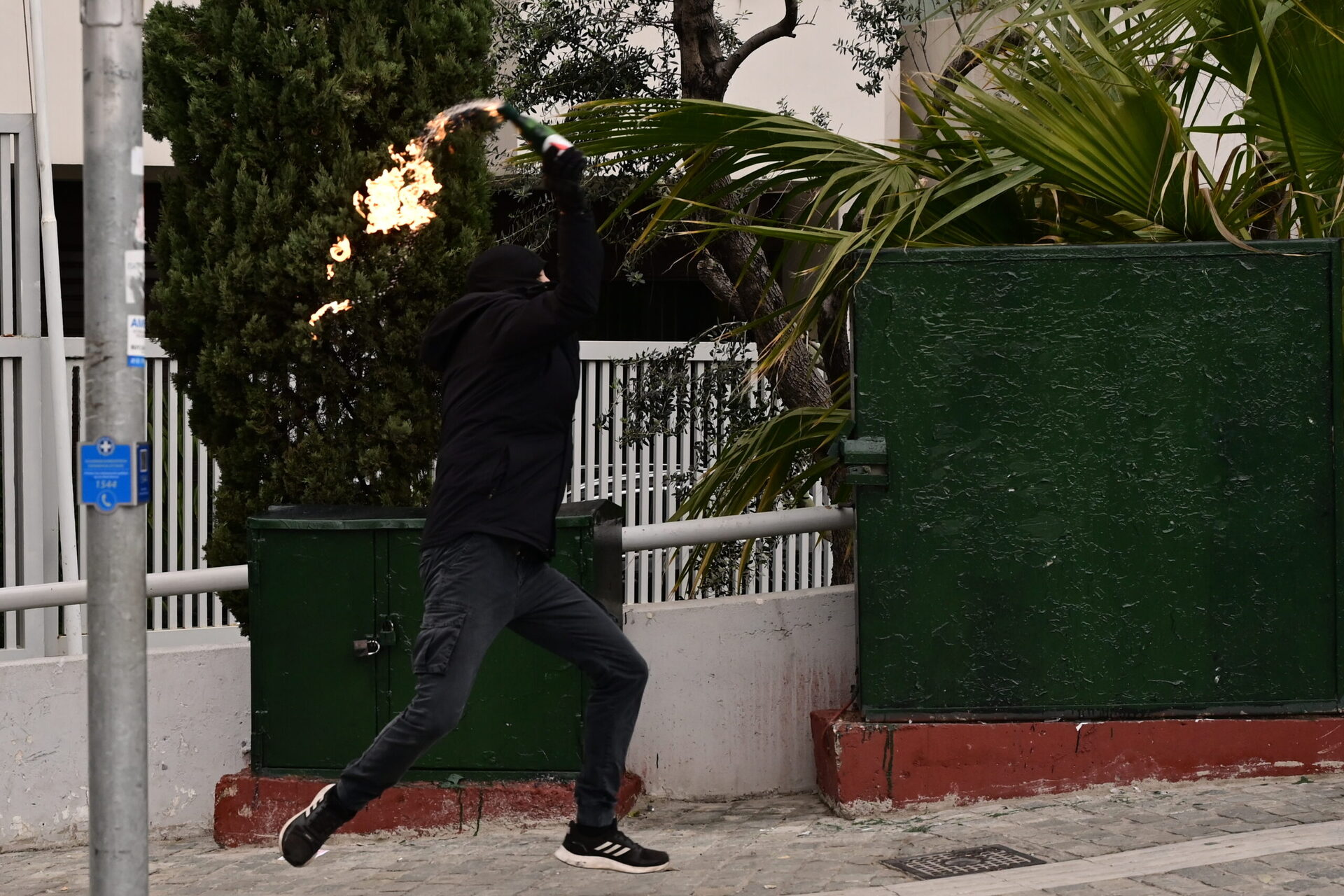 Η μία βόμβα μολότοφ έσκασε μπροστά στο άγαλμα του Βενιζέλου και η δεύτερη, στην άλλη είσοδο, μπροστά από το άγαλμα του Τρικούπη. Επικράτησε ένταση για αρκετά λεπτά και ο κύριος όγκος των διαδηλωτών άρχισε να τρέχει μακριά από την πλατεία Συντάγματος, ωστόσο η πορεία δεν διαλύθηκε.