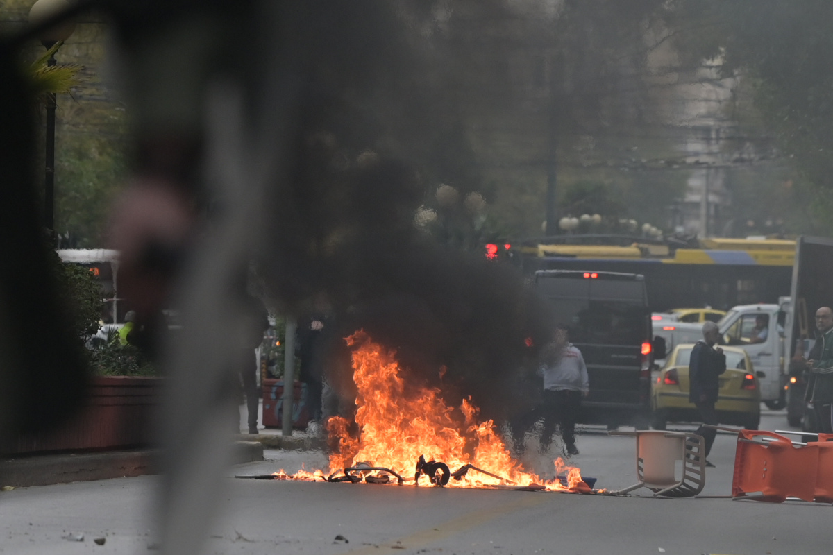 Παράλληλα, την ίδια περίπου ώρα, άλλη ομάδα ατόμων, με καλυμμένα τα χαρακτηριστικά του προσώπου τους, βγήκε από το Οικονομικό Πανεπιστήμιο Αθηνών στην οδό Πατησίων και τοποθέτησε κάδους και άλλα αντικείμενα στο οδόστρωμα, στα οποία έβαλαν φωτιά, διακόπτοντας κατ’ αυτόν τον τρόπο την κυκλοφορία των οχημάτων.