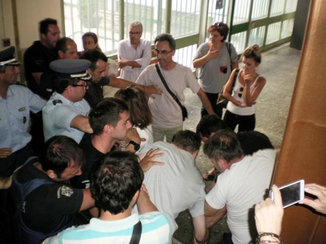 Η ένταση προκλήθηκε όταν κάποιοι συμβολαιογράφοι επιχείρησαν να εισέλθουν στην αίθουσα και εμποδίστηκαν από τους συγκεντρωμένους, με αποτέλεσμα την επέμβαση των ανδρών της αστυνομίας.