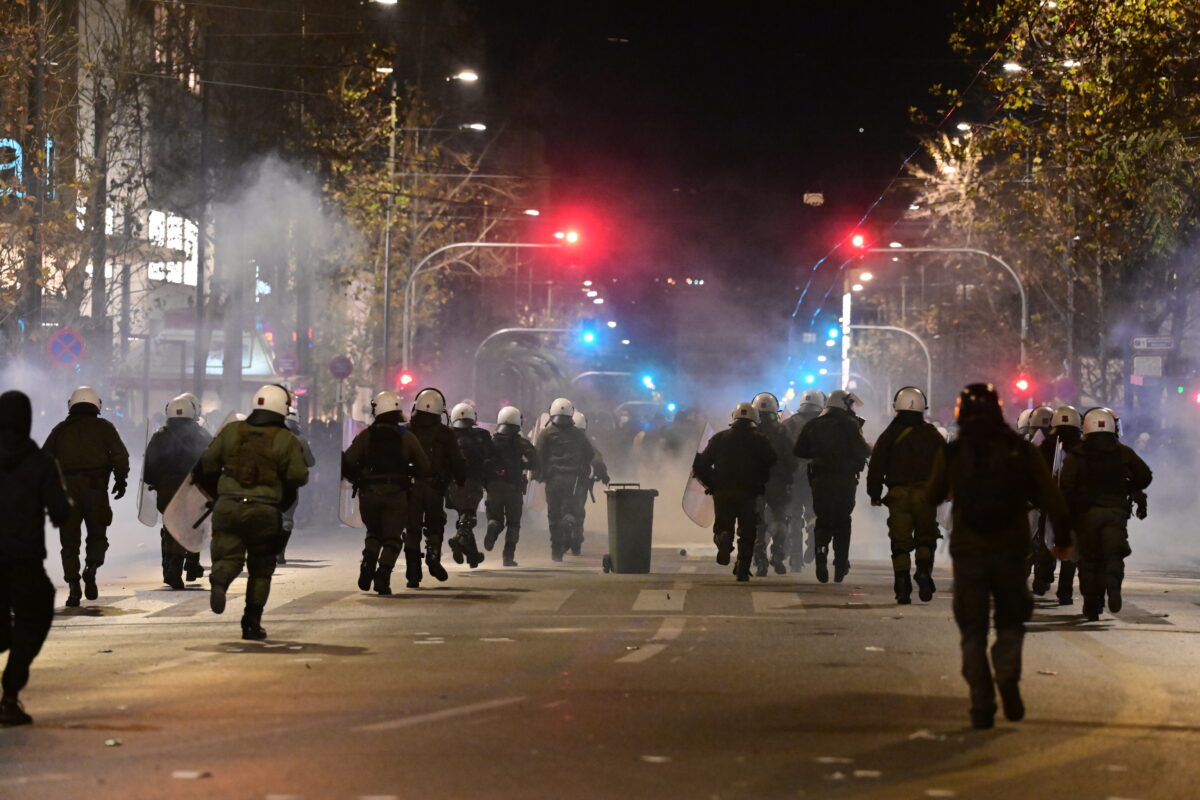 Πολυάριθμες ομάδες ατόμων -αντιεξουσιαστές και οπαδοί αθλητικών ομάδων, σύμφωνα με την ΕΛ.ΑΣ.- άρχισαν να επιτίθενται στις αστυνομικές δυνάμεις με βόμβες μολότοφ, πέτρες και άλλα αντικείμενα και να βάζουν φωτιές σε κάδους.
