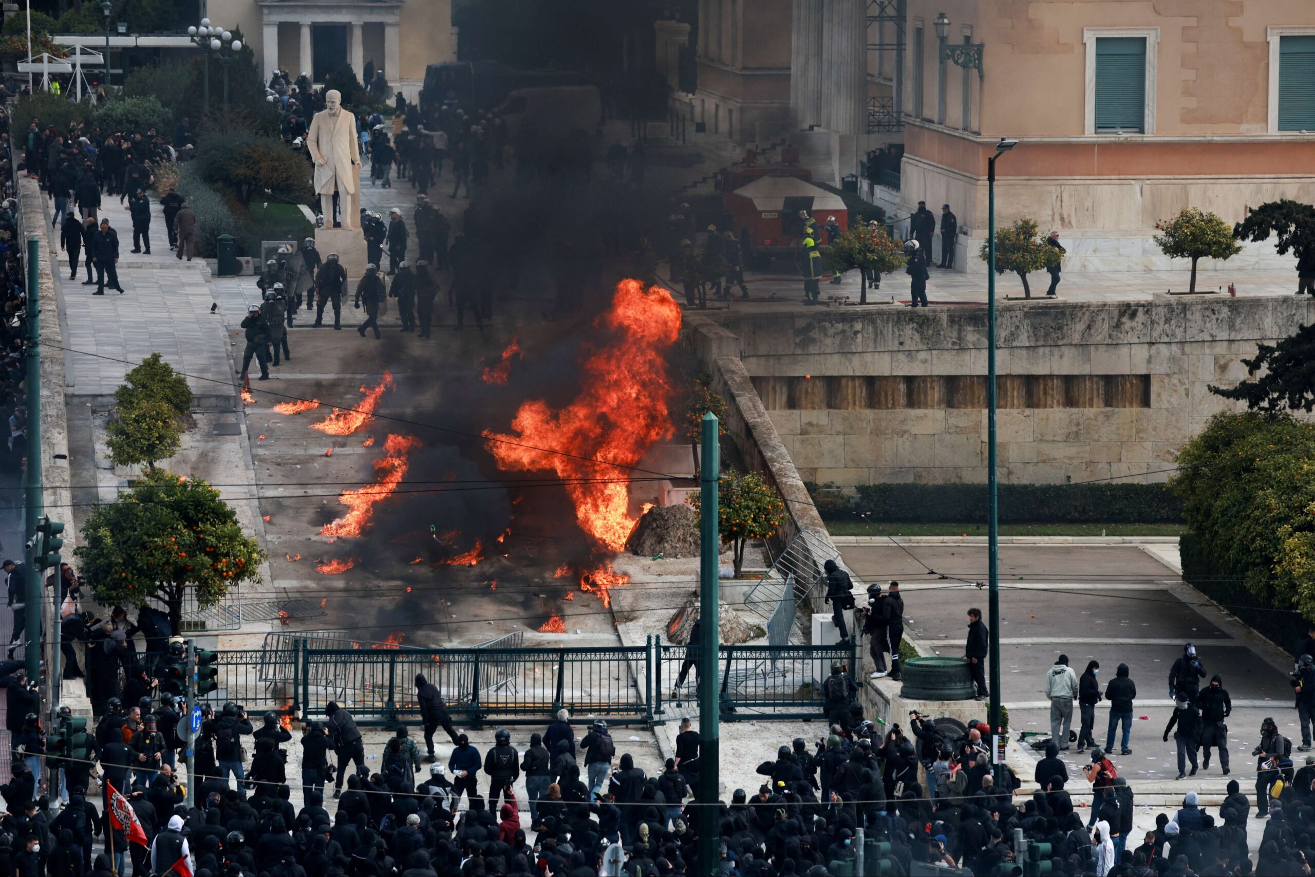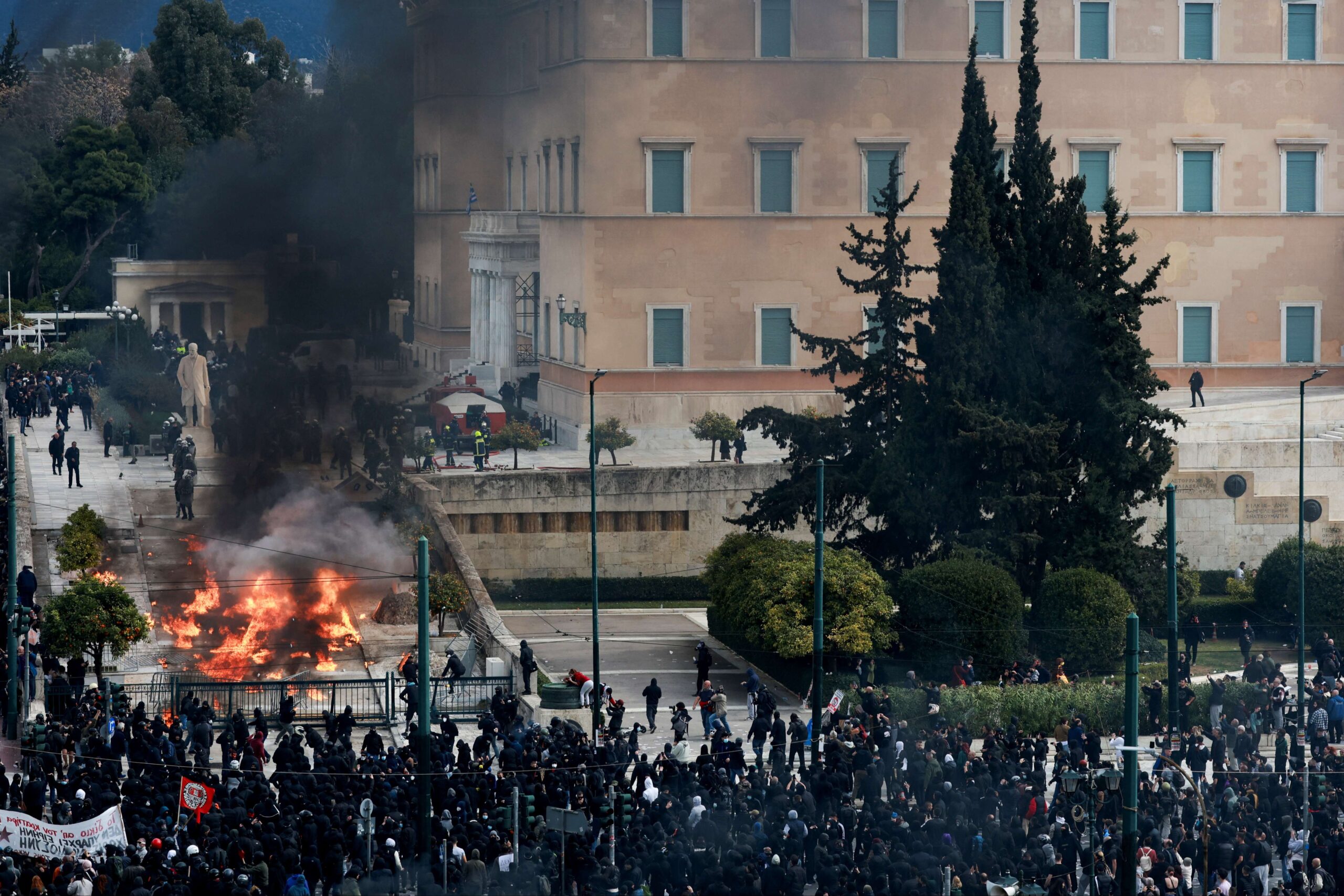 Λίγα λεπτά μετά την ολοκλήρωση του μεγαλειώδους συλλαλητηρίου κάποιοι ανεγκέφαλοι θέλησαν να κάνουν αισθητή την παρουσία τους πετώντας πέτρες και βάζοντας φωτιά στο φυλάκιο του Αγνώστου Στρατιώτη. Το συγκεντρωμένο πλήθιος προσπάθησε να τους απομονώσει, αλλά αυτή η μικρή ομάδα είχε αποφασίσει να δώσει το δικό τους σόου πετώντας πέτρες, μολότοφ και ανάβοντας φωτιές.