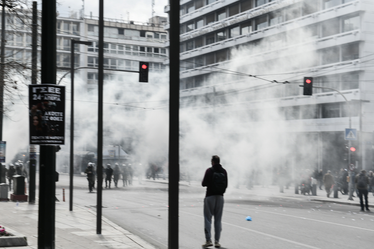 Η ένταση μεταφέρθηκε στην οδό Πανεπιστημίου όπου ομάδες κουκουλοφόρων επιδόθηκαν σε πετροπόλεμο με την αστυνομία. Οι κουκουλοφόροι έβαλαν φωτιές σε κάδους, έσπασαν φανάρια και επιχείρησαν να στήσουν οδοφράγματα. Η αστυνομία τους απώθησε προς την Ομόνοια και έκανε χρήση χειροβομβίδων κρότου- λάμψης στο ύψος της Πατησίων.