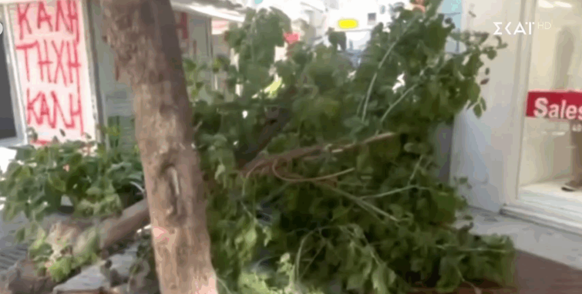 Λόγω των εξαιρετικά ισχυρών ανέμων, ένα μεγάλο δέντρο που βρίσκεται στη συμβολή της Ερμού με την Ευαγγελιστρίας έσπασε και έπεσε στο έδαφος.