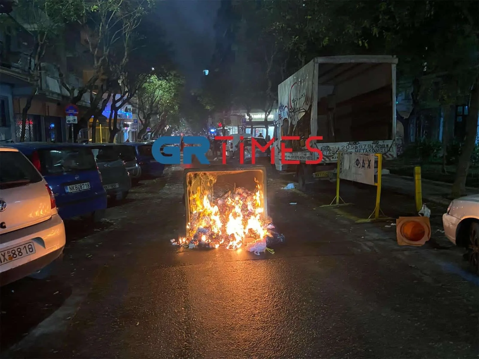 Όπως θα δείτε από την φωτογραφία του GRTimes, ομάδα ατόμων έχουν αρχίσει να καίνε κάδους σκουπιδιών.