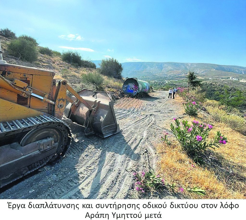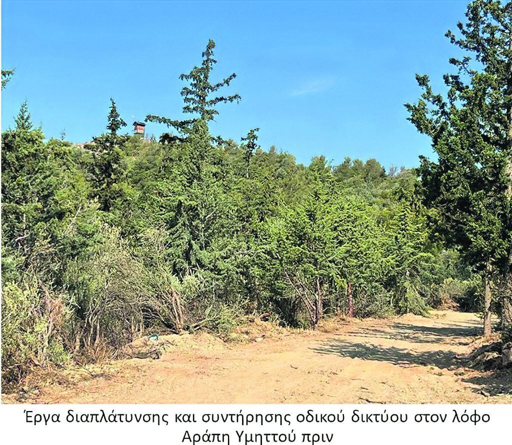 Ειδικότερα, στον Υμηττό υλοποιούνται εργασίες καθαρισμού και απομάκρυνσης καύσιμης ύλης σε δασική έκταση 2.220 στρεμμάτων, διαπλάτυνσης και συντήρησης δασικού οδικού δικτύου μήκους 90 χιλιομέτρων, ενώ απομακρύνονται αυθαίρετες ξύλινες κατασκευές.